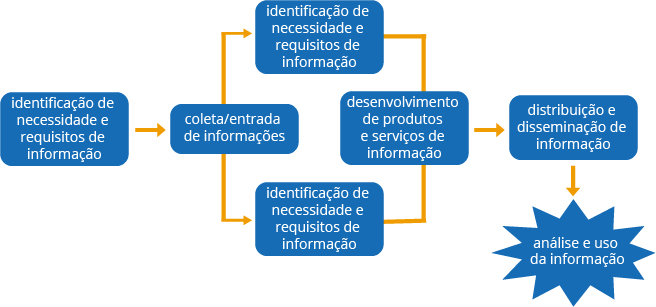O fluxo da informação se inicia com a etapa de identificação de necessidade de informação. Estabelecida a necessidade de informação, define-se as formas de coleta. Após coletadas, as informações sofrem duas intervenções: são classificadas e armazenadas; e recebem tratamento. A classificação e o tratamento da informação permitem o desenvolvimento de serviços de informação, que por sua vez possibilitam a disseminação da informação. A informação disseminada permite sua análise e a utilização.